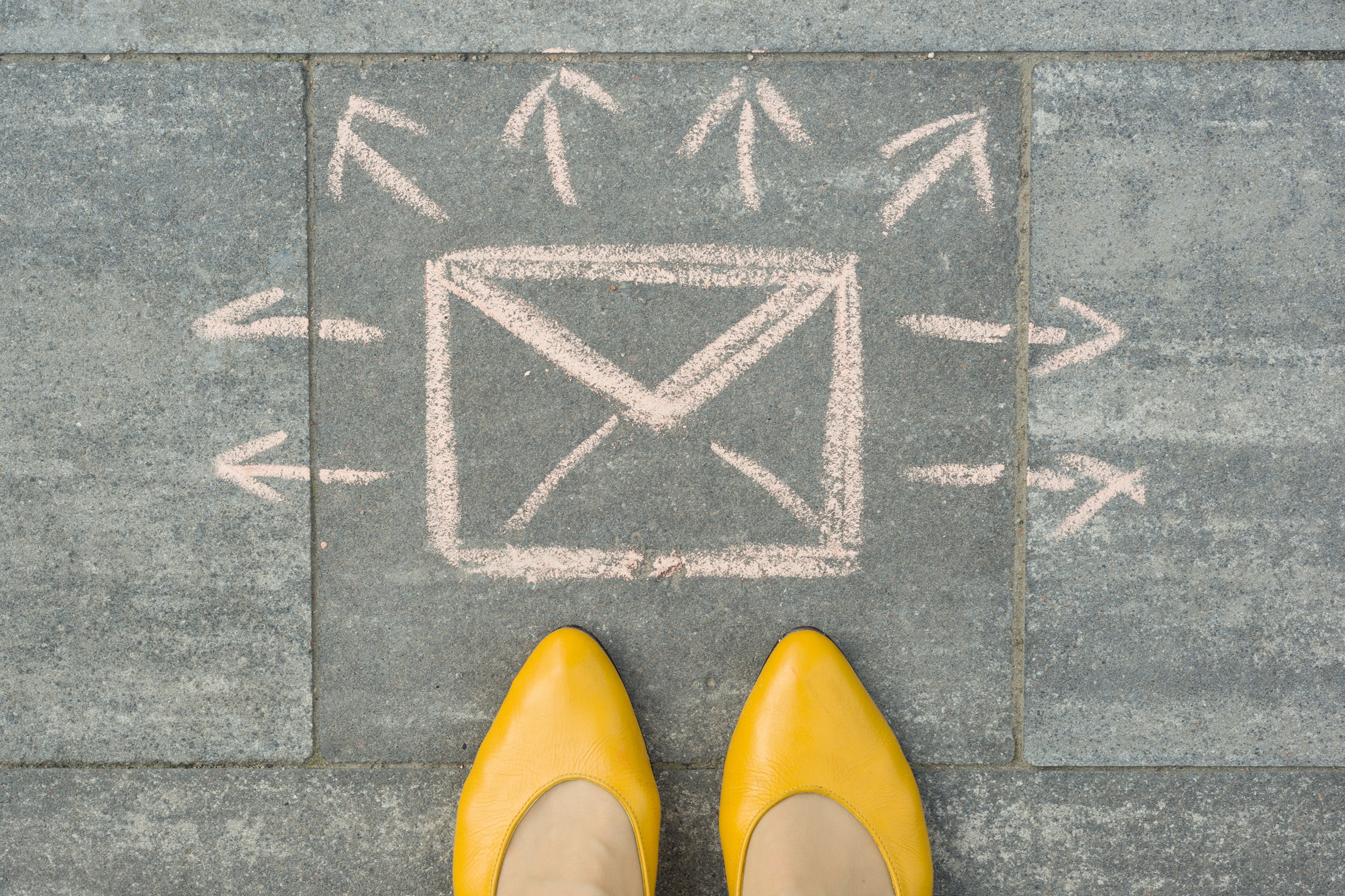 Female feet with abstract envelope message letter with arrows in different directions, written on grey sidewalk.